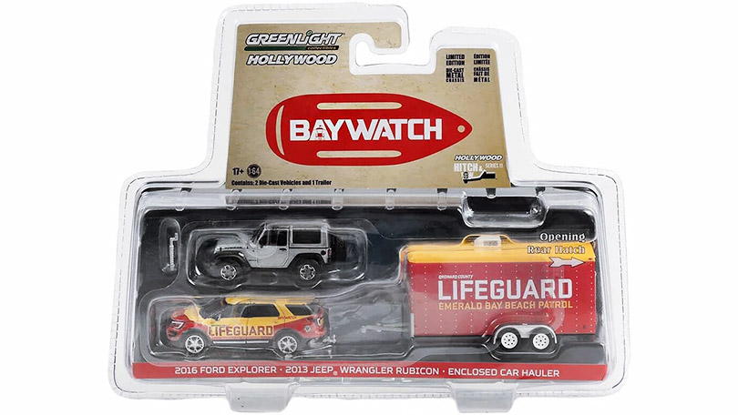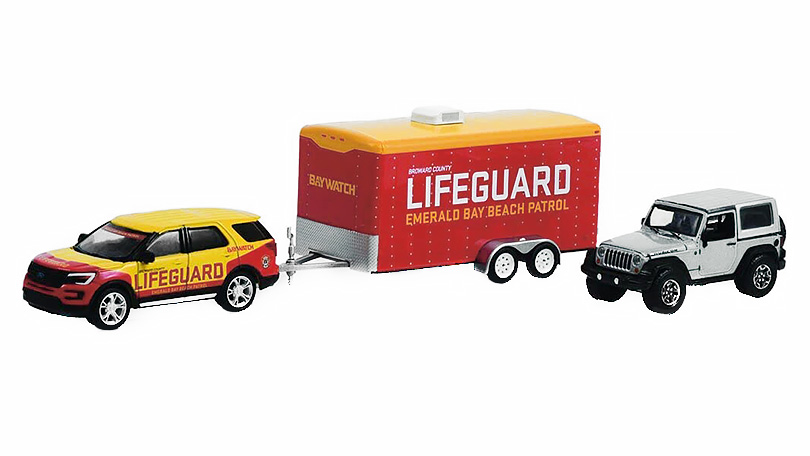 Úvod » Speciální auta » Ford Explorer + Jeep Wrangler Rubicon + přívěs Baywatch 1:64 - GreenLight